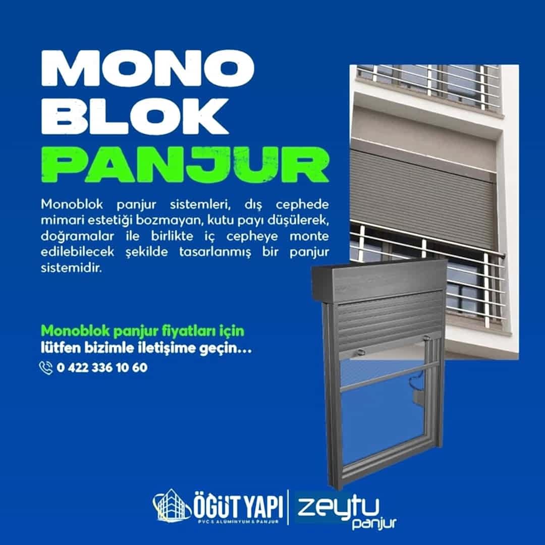Monoblok panjur sistemleri, dış cephede mimari estetiği bozmayan, kutu payı düşülerek, doğramalar ile birlikte iç cepheye monte edilebilecek şekilde tasarlanmış bir panjur sistemidir. Monoblok Panjurlar her türlü yeni yapılarda ve tadilatlarda her marka pancerelerin üzerine monte edilebilen, plastik kutulu, yalıtımlı, son derece estetik ve modern görünümü ile güvenlik ihtiyaçlarınızın yanısıra her türlü projeye kolaylıkla uyum sağlar.